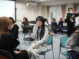 昼食をはさんで、午後からはクラス別に分かれグループワーク「総当たりインタビュー」を行いました。毎年盛り上がるワークです。このワークは、インタビューする側とされる側でペアを作り、テーマに沿ったインタビューを行うというものです。時間が来たらする側とされる側の役割をチェンジするというものです。今年は多くのテーマで2時間の「総当たりインタビュー」を行ったので、クラスのほとんどの学生と話すことができました。