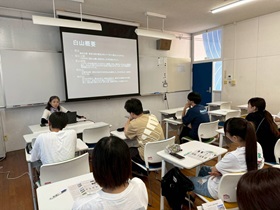 「白山手取川ジオパーク演習」は、「白山市が有する豊かな自然環境、文化、歴史である『ジオ(大地)』の魅力を伝える人材がいない」という課題を解決するために、本学と白山市観光文化スポーツ部ジオパーク・エコパーク推進課、白山手取川ジオパーク推進協議会、白山市観光連盟の3つの地元自治体が連携し、来訪者へ魅力を伝える「白山手取川ジオパーク公認観光ガイド」の人材育成を目的とした実践的PBL型の授業です。