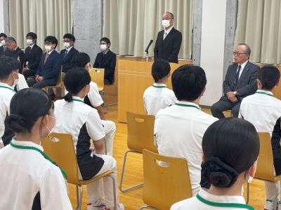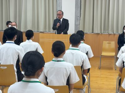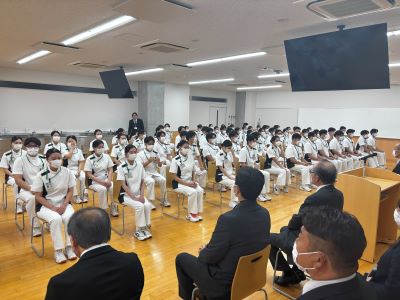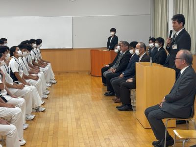 学生は、米島学長、木林副学長、河野学部長、永井実習委員長から激励を受け、学生代表の理学療法学科原田みの里さんが、「感謝の気持ちを忘れず、最後まで責任を持って実習に臨む」という決意を述べました。