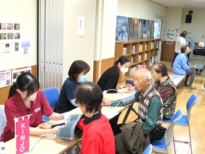 11月5日(水)まちづくり鳥越、鳥越地区社会福祉協議会主催の「ちょっと寄って♪健康サロン」に、看護学部の学生と教員が参加しました。開業保健師による講演や理学療法士による体操、健康測定が行われ、40名を超える来場者に大盛況のイベントとなりました。参加された方々は“こびり”と言われる茶菓子をつまみながらの談笑も楽しまれていました。やまの保健室は、血圧測定、骨密度、体組成、血管年齢(血流測定)を担当しました。お一人おひとりに合わせた対応を心がけ、一緒に測定結果に一喜一憂しながらも和やかな時間を過ごすことができたと感じています。
