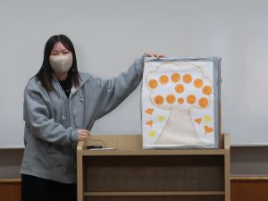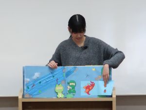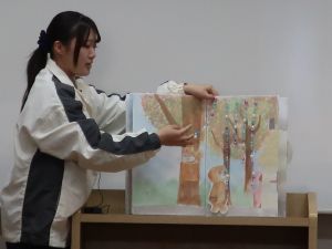 学生たちは、10月に行われた幼児教育実習Ⅰで、この自作大型絵本を実際に子どもたちに読み聞かせを行ってきました。 発表の場では、絵本を読んだときの子どもたちの具体的な反応についても共有されました。 「もっと読んでほしい」「じぶんでも作ってみたい!」など、嬉しい反応を得たことを語ってくれました。 実習で得たこの経験を、今後の実習準備や教材研究に活かし、さらに子どもの視点に立った保育実践力を高めていってほしいと期待しています。