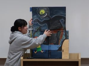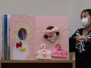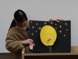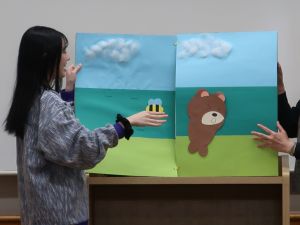 11月12日(水)、11月19日(水)の幼児教育実習指導の授業で3年生が自作の「大型絵本」を発表しました。 子どもたちのイメージが広がるように楽しいお話や仕掛け、素材にもこだわるなど個性豊かな作品が見られました。 楽しいお話や素材の面白さ、驚きの仕掛けがありました。 ページが広がったり、シルエットクイズを楽しんだり、パペットと一体になっていたり、 それぞれに工夫があり丁寧に作られています。