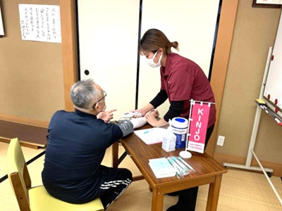 11月17日(月)に久保集会所で開催された元気サロンに、看護学部の学生2人と教員3人が参加しました。参加者の皆さんと一緒に体操に参加したあと、大門園のスタッフの方が準備してくださったお茶とお菓子をいただきながら参加者さんとの会話を楽しみました。皆さん気さくに暮らしやご自身のことなどを話してくださいました。唾液ストレスチェックと、指の組み方と腕の組み方で分かるセルフチェックを行い、今の状態を知っていただきました。笑顔にあふれる時間を共に過ごすことができました。