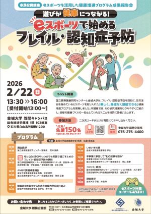 2月22日(日)、金城大学において健康増進プログラムの成果報告会が開催されました。本プログラムは、医療健康学部と国立長寿医療研究センターが連携し、国立研究開発法人日本医療研究開発機構(AMED)の事業の一環として実施されました。地域高齢者の健康維持・増進を目的に、学生と参加者がともにeスポーツを活用した活動に取り組んだ成果報告です。成果報告会では、参加者・学生代表による活動報告と感想発表が行われ、国立長寿医療研究センターの先生方より講評および総括をいただきました。世代を超えた交流の意義や、eスポーツを活用した健康支援の可能性が改めて示されました。