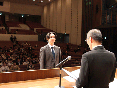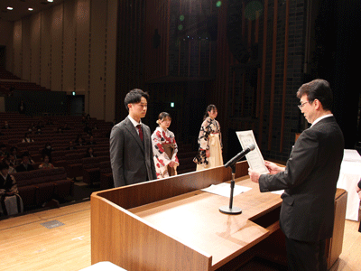 式典では、河野学部長からお祝いと激励の言葉が贈られ、卒業生と修了生に学位記が手渡されました。続いて学部長表彰などの表彰が行われ、最後に卒業生を代表して理学療法学科の竹田文乃さんが思い出や感謝の言葉を述べ、厳かな授与式が閉式となりました。